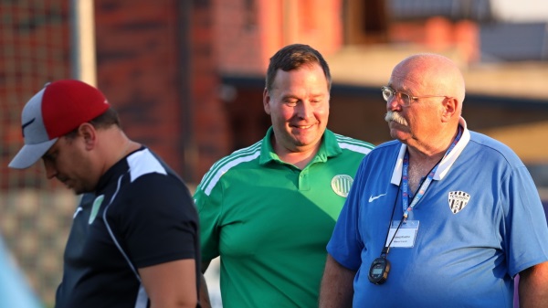 Trenér Miroslav Supáček (na snímku Bohumila Kučery s Karlem Kukelkou) vedl béčko Hostouně dlouho a s úspěchem, dokonce s ním vážně útočil na A třídu. Teď už jako kouč Slavoje Kladno přijel v neděli na známý stadion jako protivník a odvezl si těsnou výhru 3:2. Už třetí v řadě.